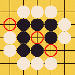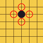 Liberty: Any unoccupied point adjacent to a stone or a group of stones is a "liberty" of that stone or group of stones. examples of liberties...the red circles indicate the liberties for each stone or group of stones. Note 2 things.. "inside" liberties are just as important as "outside" liberties. Also.. the diagonal points are NOT considered liberties.